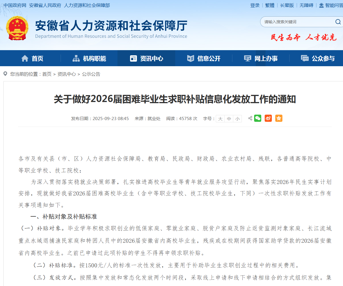 关于做好2026届困难毕业生求职补贴信息化发放工作的通知