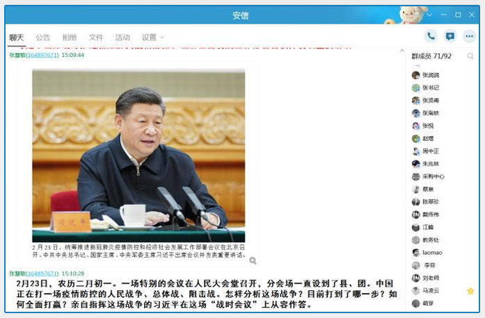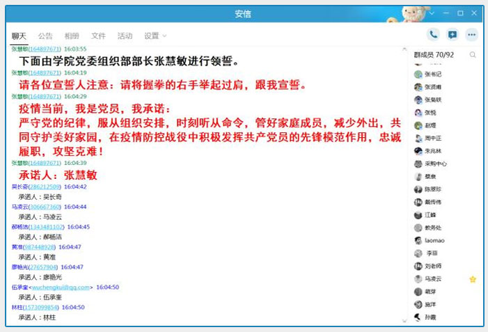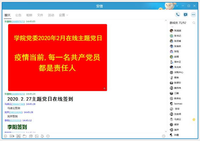 为积极响应疫情防控不聚集、不会面、少出门的号召,确保疫情防控期间学院基层党支部和党员的组织生活不间断、党性锻炼不停止、制度落实不松懈, 2月27日下午,学院党委依托学院qq工作群,举行了“疫情当前,每个共产党员都是责任人”线上主题党日学习活动。会议由学院党委组织部部长张慧敏主持,35名党员到会,部分入党积极分子和教职工列席,共计71人参加。