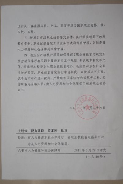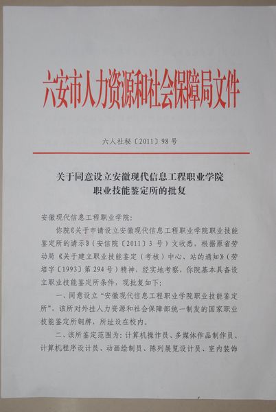 日前,六安市人力资源和社会保障局正式下文,同意我院设立专业技能鉴定所,对外挂“人力资源和社会保障部统一制发的国家职业技能鉴定所铜牌。