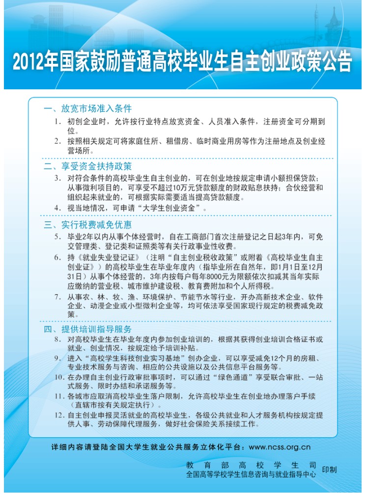 2012年国家鼓励普通高校毕业生自主创业政策公告
