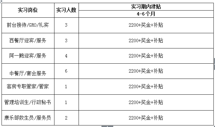 2、食宿环境:1)、实习生免费食宿,宿舍在酒店内,一步之遥,基本按3-4人/间入住安排,宿舍内设置无线网络、空调。