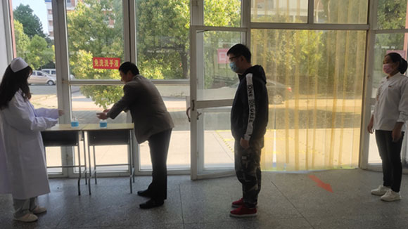 演练从模拟学生排队等候进入校园开始,由班主任志愿者“扮演”的学生,入校时戴好口罩,分2条通道排队等候体温检测,保持一米以上间距,工作人员对学生的手、鞋底和书包进行消毒。