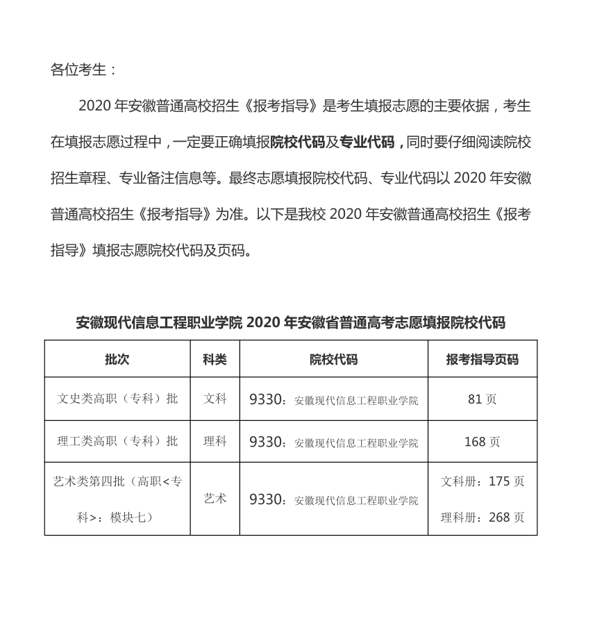 安徽现代信息工程职业学院2020年安徽省普通高考志愿填报院校代码