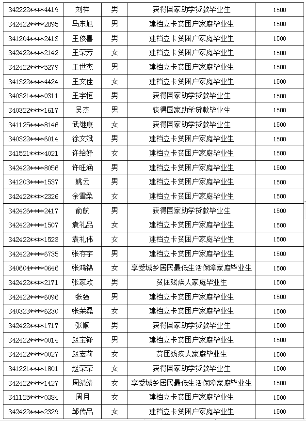 为进一步做好2021届困难毕业生就业工作,根据皖人社明电《关于做好2021届毕业生求职创业补贴信息化发放工作的通知》〔2020〕135号的文件精神,经过学生网上申请、学校初核和网上审核,白付红、程浩、胡丽霞等52名毕业生符合发放求职创业补贴条件(名单见附件),现予公示。公示时间5个工作日(2020年11月27号12月2号)如有异议,请向校毕业生就业指导中心反映,联系电话:0554-4108666。