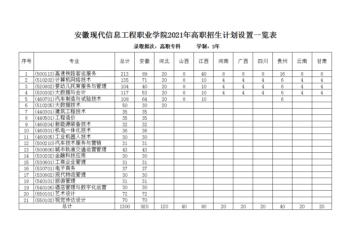 安徽现代信息工程职业学院2021年高职招生计划设置一览表