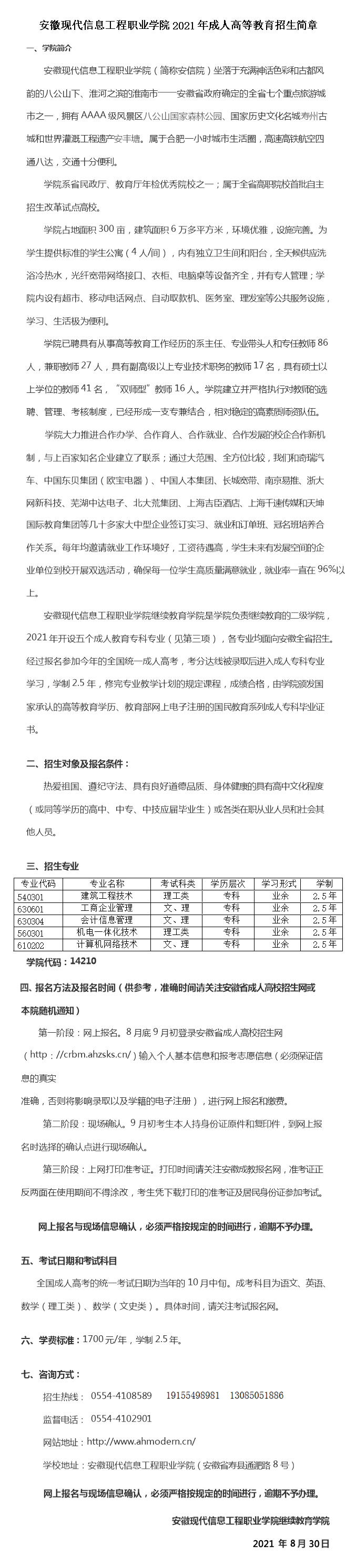 安徽现代信息工程职业学院2021年成人高等教育招生简章