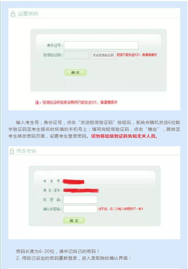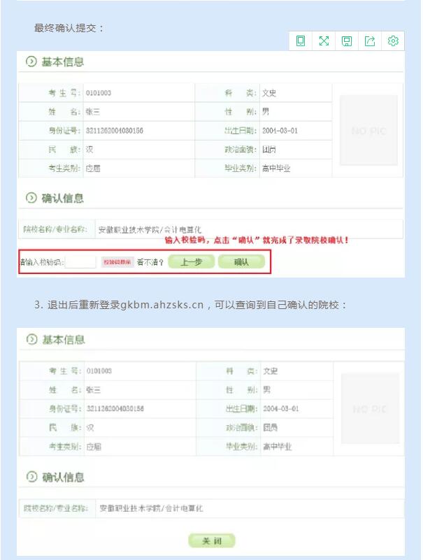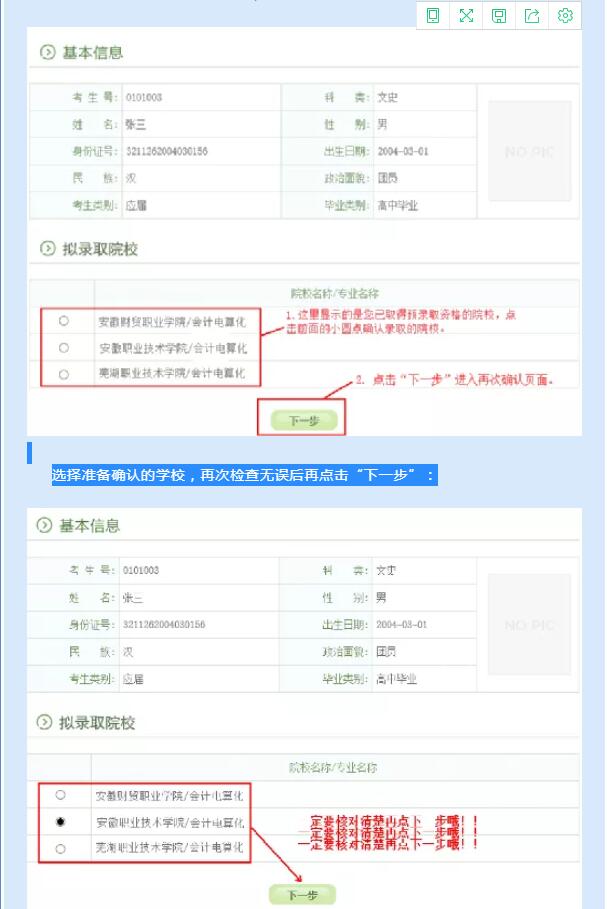 特别提醒:高职扩招录取确认只有在规定时间内(10月11日-12日),在规定网站(gkbm.ahzsks.cn)上操作方为有效。请各位考生一定要妥善保管自己的考生号、身份证号等个人信息,切勿泄露给其他人,更不要委托他人代替自己确认。一旦确认了录取院校,是不能修改的!!!