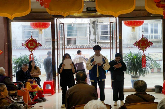 早上八点,一群怀着“关爱之心,服务之心”的学子带着礼物从学院徒步前往寿县红星敬老院。