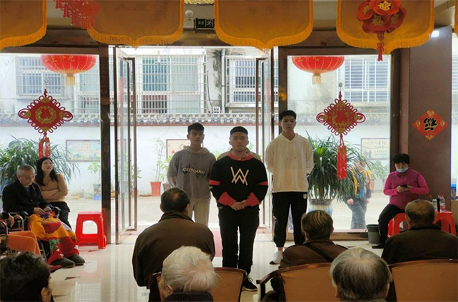 稍作休息后,学生们开始了他们为敬老院的老人们精心准备的节目,唱红歌、跳舞、大合唱,各种各样的表演应有尽有,给老人们带来了欢乐与幸福。文艺节目表演过后,敬老院的老人们还饶有兴趣地为同学们讲述他们改革开放前后亲身的经历,让同学们深刻认识到今天的幸福生活来之不易。