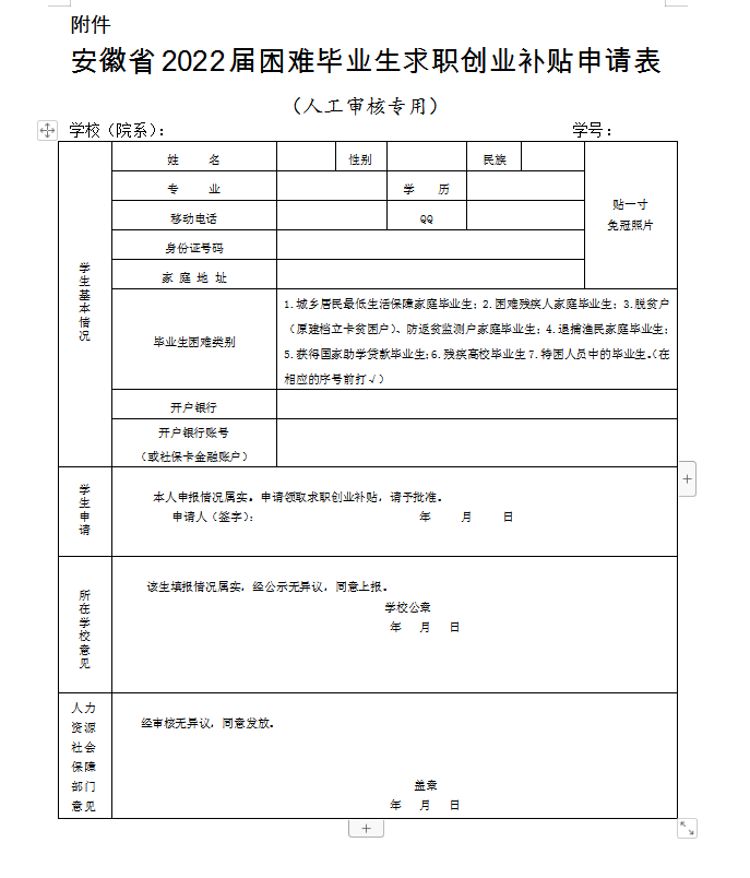 附件:安徽省2022届困难毕业生求职创业补贴申请表