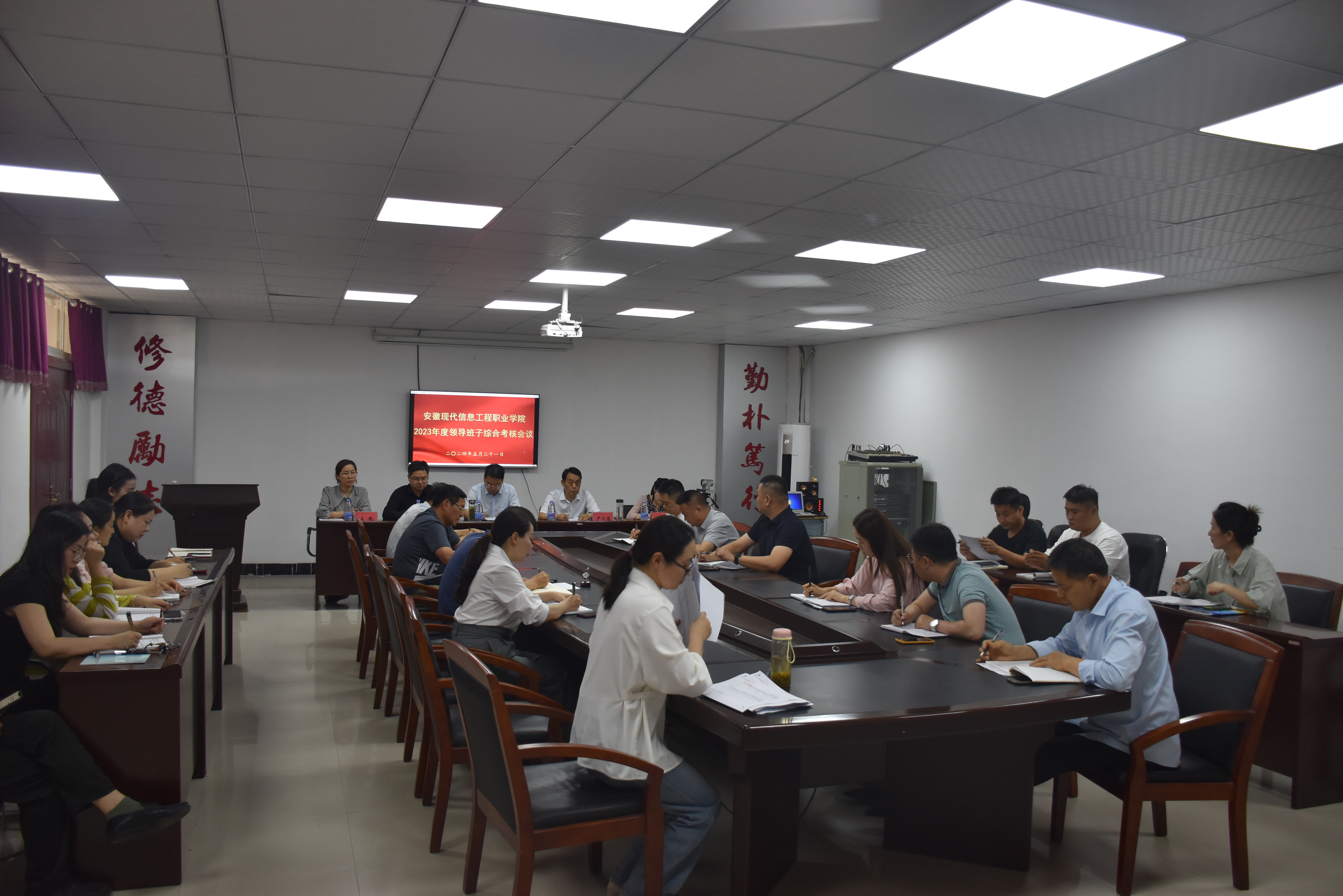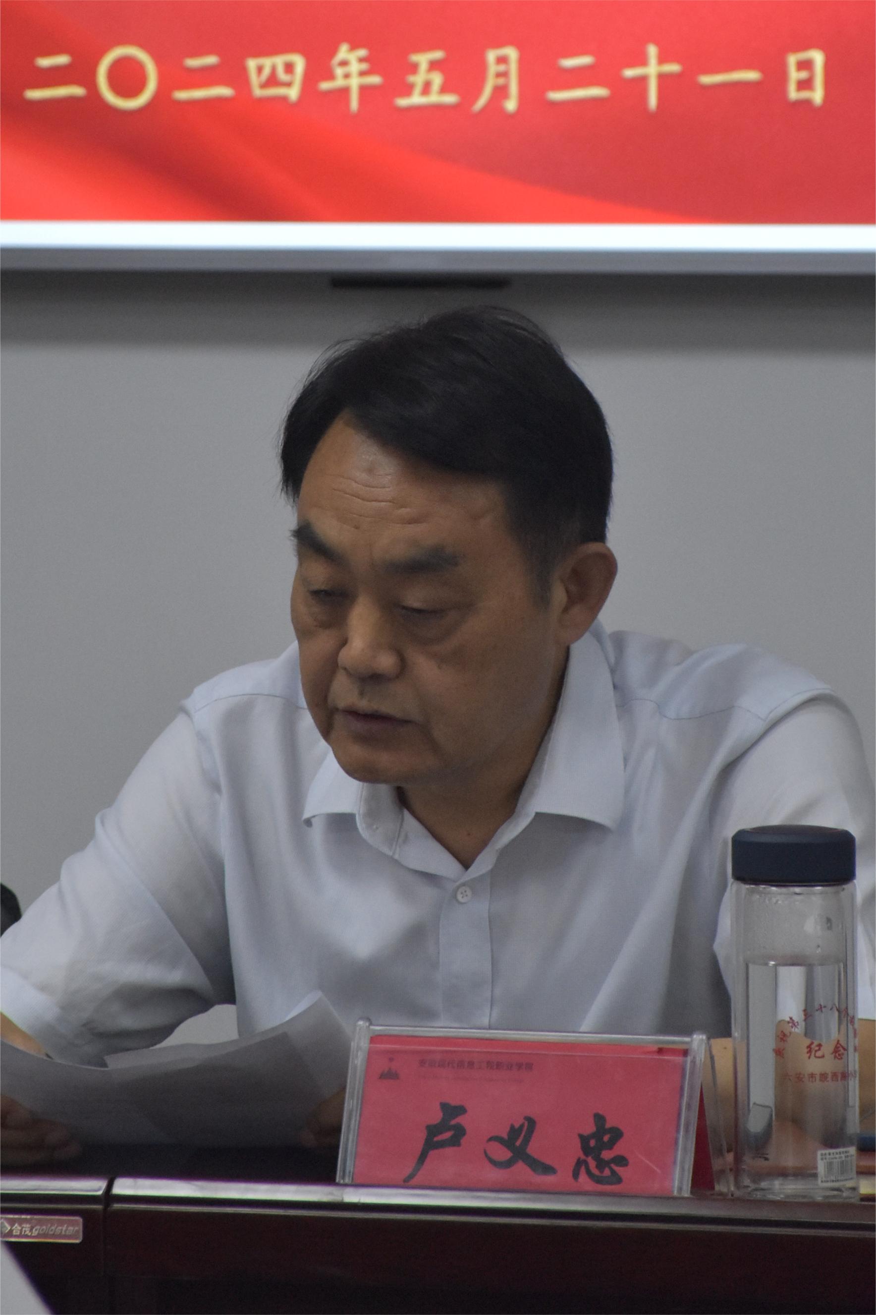 根据淮南市教体局党委2023年度综合考核工作部署,2024年5月21日下午,市教体局综合考核组对我院领导班子和领导干部2023年度工作情况进行考核。考核会议由我院党委书记、督导专员卢义忠同志主持,学院全体领导班子、二级单位主要负责人、讲师以上教师代表参加了会议。