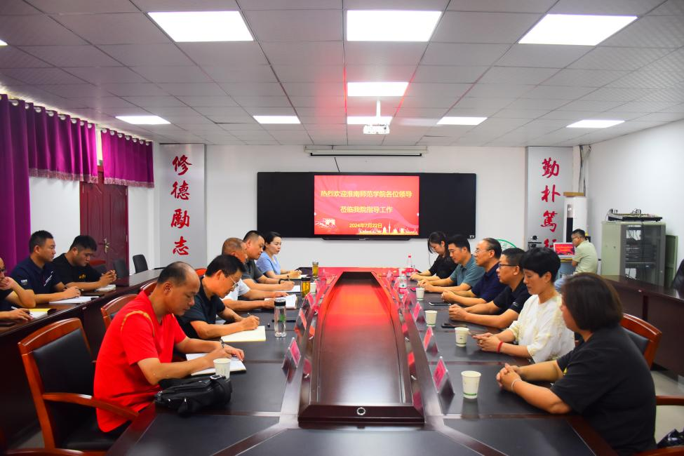 7月22日下午在我院行政二楼会议室一场教学交流研讨会正在举行,淮南师范学院国际合作与交流处处长、博士生导师夏维奇教授,体育学院党委书记葛士顺、院长阮宜杰等一行6人莅临我院进行工作指导与交流。我院院长肖成兵,副院长李阳等领导和部分教师人参加了交流研讨会。