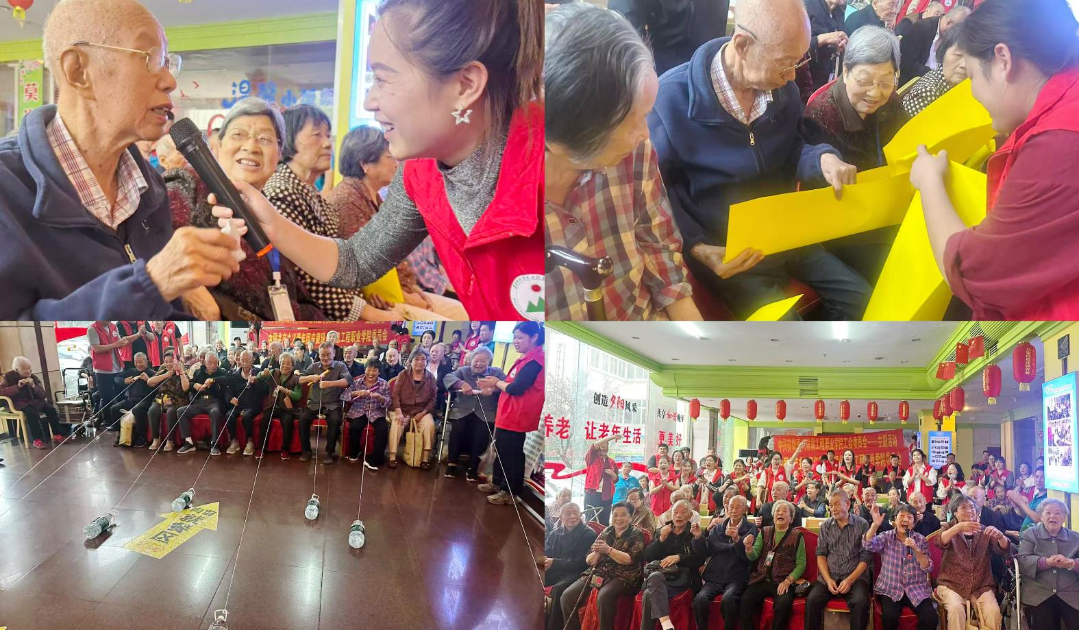 活动现场暖意融融,互动环节精彩纷呈。在“水瓶快跑”、“全体传球”等精心设计的游戏中,老人们精神矍铄、踊跃参与,与师生们默契配合、欢声笑语不断,昔日宁静的敬老院充满了温馨与活力。为了让老人们更开心,党员教师们还主动献上了精心准备的才艺表演,演唱了黄梅戏等戏曲。熟悉的旋律勾起了老人们的美好回忆,他们纷纷跟着哼唱。最后,全体师生与老人们共同起立,齐声高唱《歌唱祖国》。激昂的歌声抒发了大家对祖国的无限热爱与美好祝福,将整个活动的气氛推向了高潮。