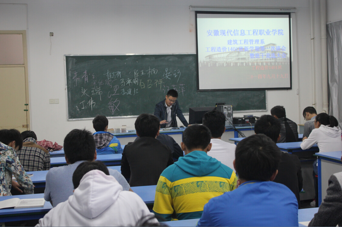 2014年9月19日上午8时整,我系工程造价1401班新同学迎来了入学来第一次班会,在班主任李军老师的精心筹备下,在学院行知楼4101多媒体教室顺利召开。