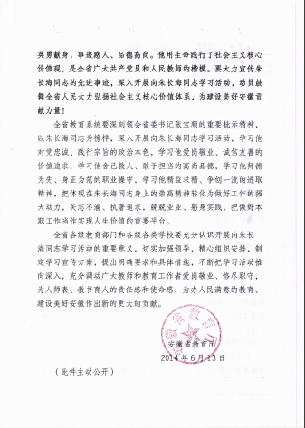 安徽省教育厅关于在全省教育系统开展向朱长海同志学习活动的通知