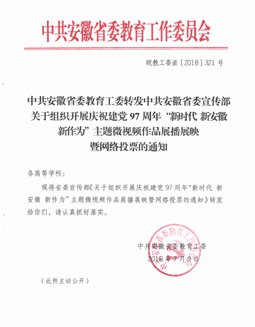 关于组织开展庆祝建党97周年“新时代 新安徽 新作为”主题微视频作品展播展映暨网络投票的通知