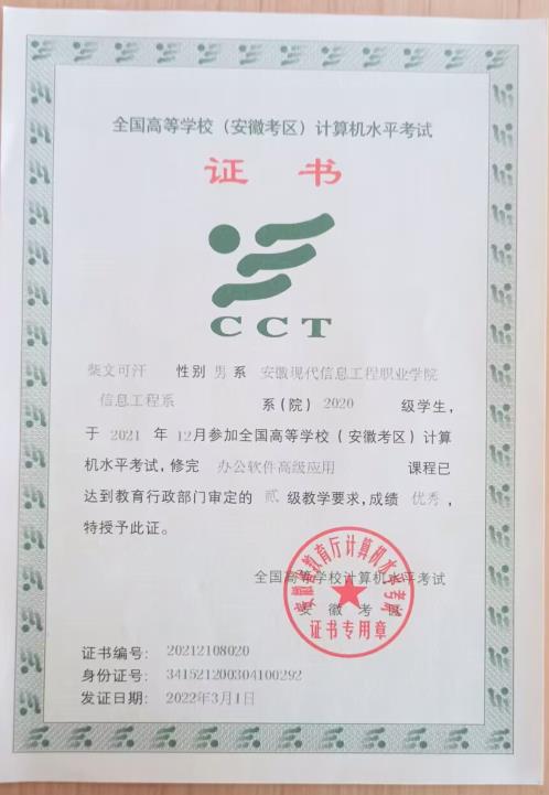 安徽省计算机一级考试优秀证书