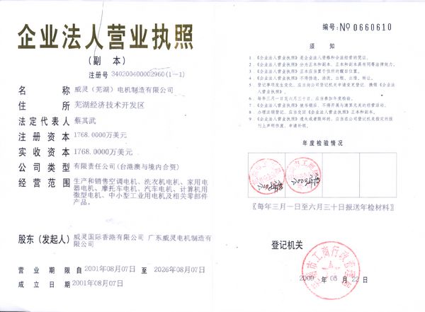 我公司是广东美的集团成员企业,隶属美的集团微电机事业部在安徽芜湖的生产基地。主要生产空调电机、冰箱压缩机电机、泵类电机等产品。1999年11月注册成立,占地面积14万平方米,拥有员工4000多人。威灵小功率电机入选2006年“中国名牌产品”。在综合经济效益评选活动中,名列“芜湖市工业企业20强”、“安徽省民营企业50强”,多年获得“安徽省先进技术企业”、“安徽省外商投资经济效益先进企业”等称号,2008年荣获“国家高新技术企业”称号,2009年被评选为“全国优秀外商投资企业”。