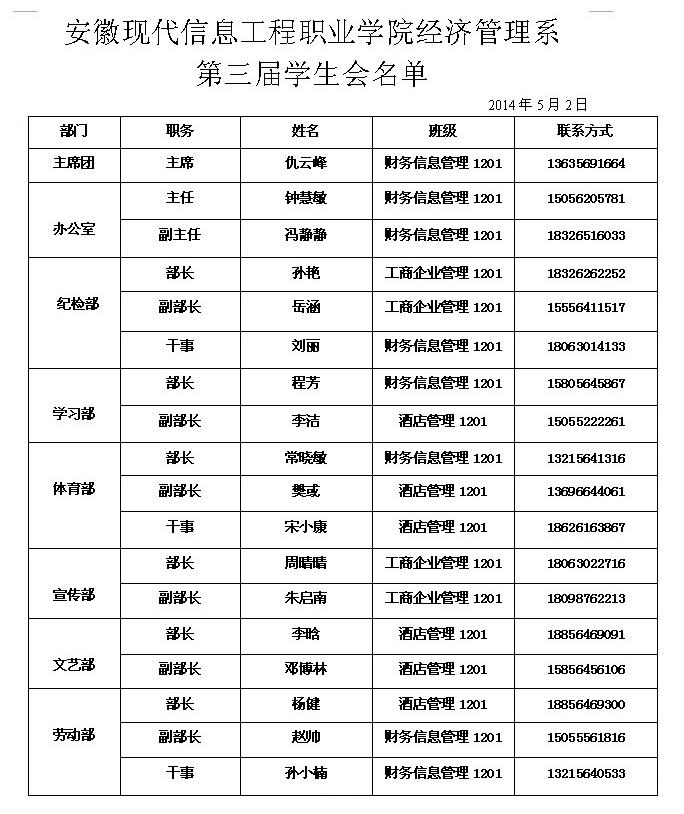 安徽现代信息工程职业学院经济管理系 第三届学生会名单