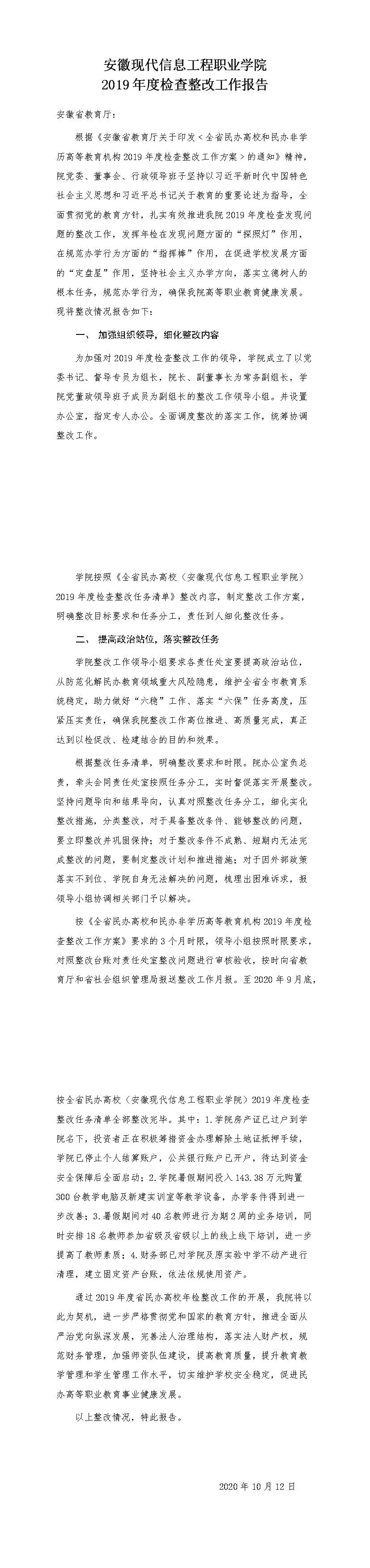 安徽现代信息工程职业学院2019年度检查整改工作报告
