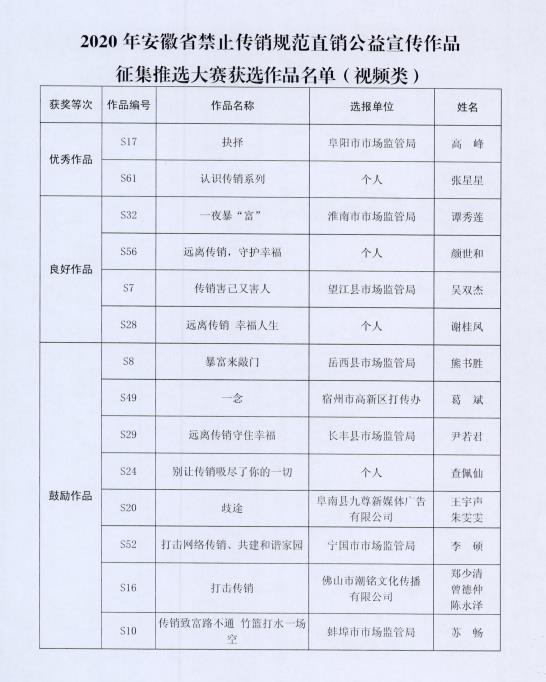关于公布2020年安徽省禁止传销公益宣传 作品征集推选大赛获选作品的通知