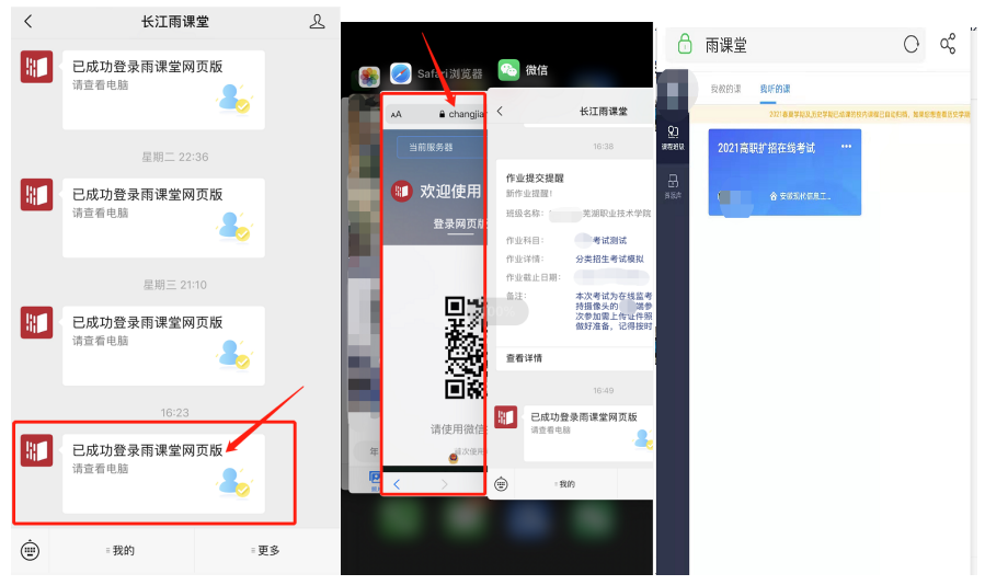 1、手机微信收到长江雨课堂考试通知,用手机浏览器百度搜索:长江雨课堂网页版或者直接访问网址:changjiang.yuketang.cn 进入登录界面,按照网页版的流程进行考试。
