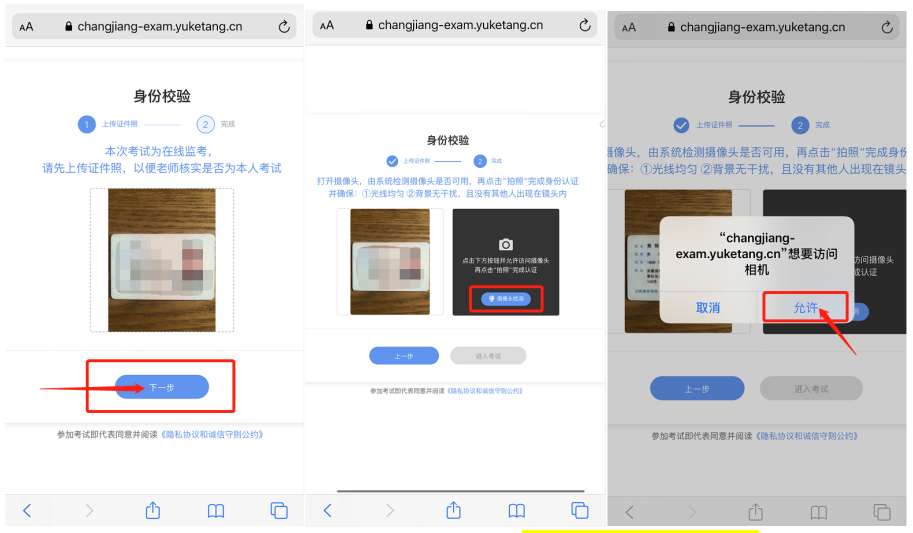 成功上传证件照后,点击摄像头检测,允许手机浏览器访问相机。