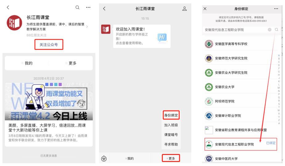 2、点击右下角“更多”-“身份绑定”-搜索并选择学校“安徽现代信息工程职业学院”