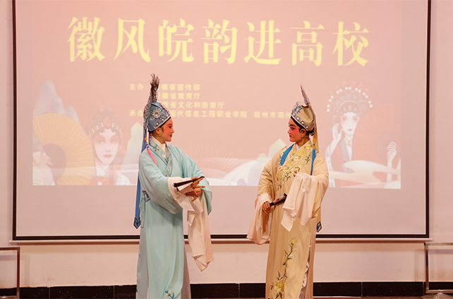 3月21号下午,由安徽省委宣传部、安徽省教育厅、安徽省文化和旅游厅主办,宿州市泗州戏剧团承办的2023年“校园大舞台,徽风皖韵进高校”活动在我院多功能厅隆重举行。院长魏捷、执行董事曹学华、团委书记李阳等领导,以及三百余名学生观众观看了本次演出。