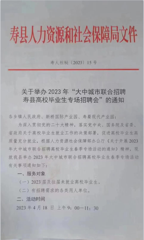 关于举办2023年“大中城市联合招聘寿县高校毕业生专场招聘会”的通知