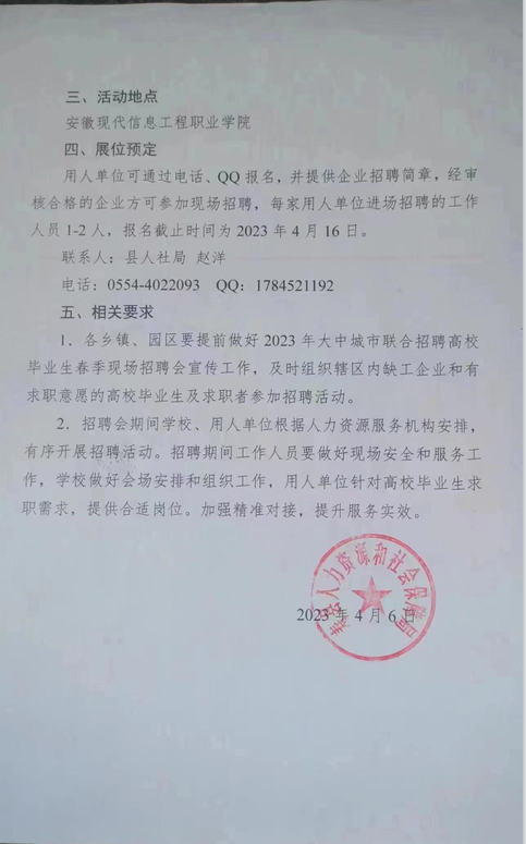 展位预定:用人单位可通过电话、QQ报名,并提供企业招聘简章,经审核合格的企业方可参加现场招聘,每家用人单位进场招聘的工作人员1-2人,报名截止时间为2023年4月16日。