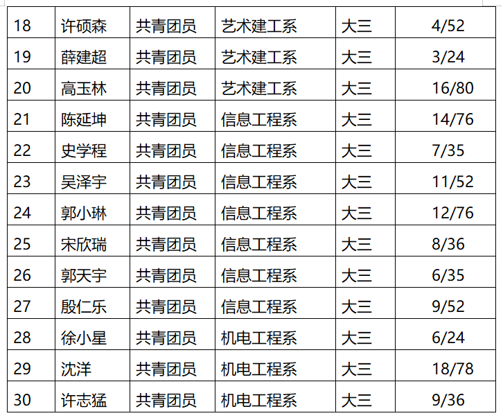 (一)带头勤奋学习,学好专业知识,学习成绩综合排名在本专业前30%以内,且无课业不及格情况。(15分)