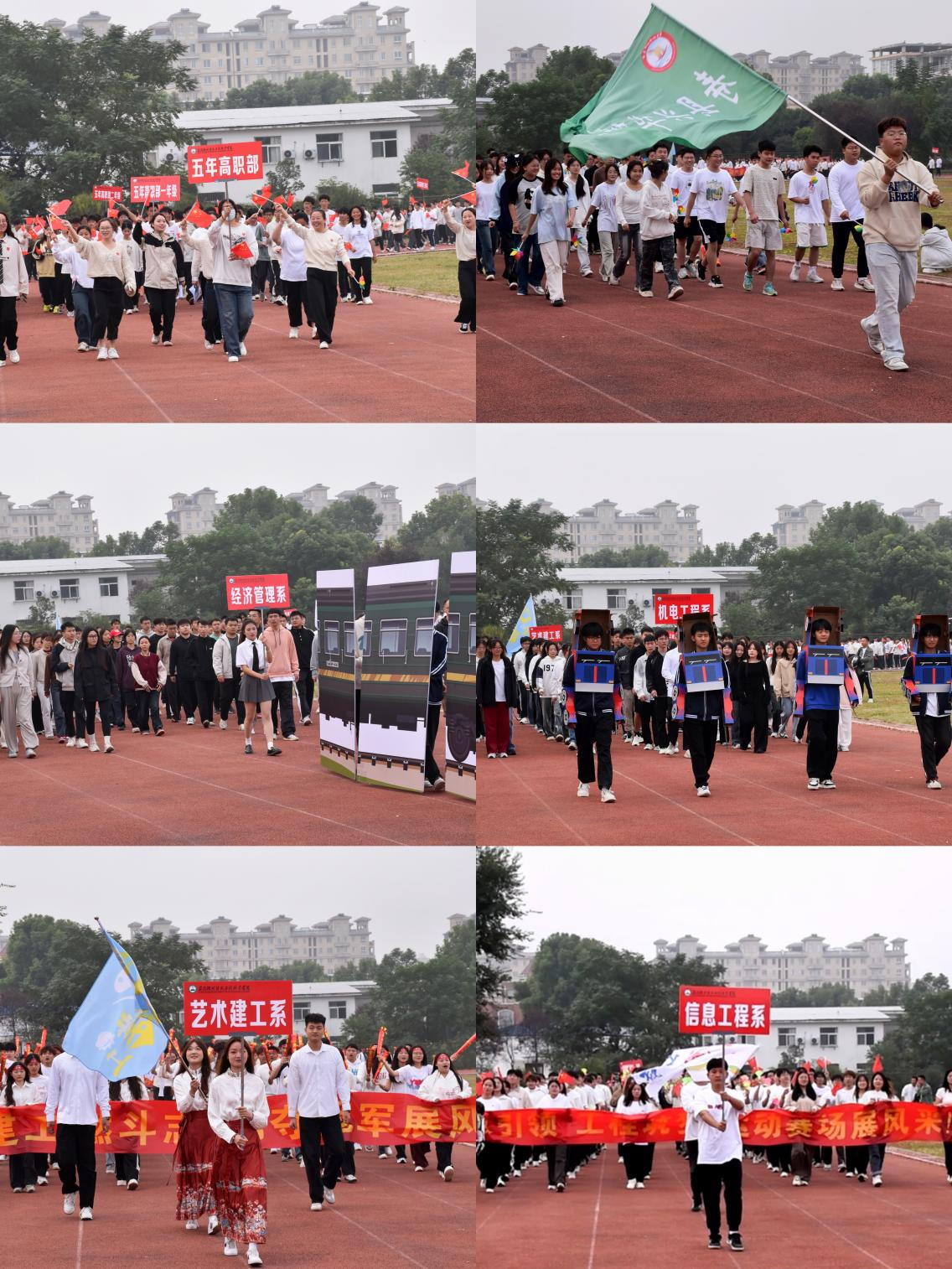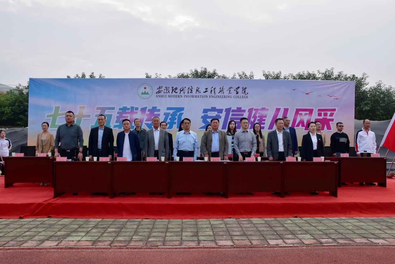 随着激昂奋进的《运动员进行曲》响起,国旗队、校旗队、会旗队、表演方阵队、裁判员代表队及各系教师学生代表队依次入场。他们迈着矫健的步伐,精神抖擞,气势如虹,展现出安徽现代信息工程职业学院学子们积极向上的精神风貌和青春活力。