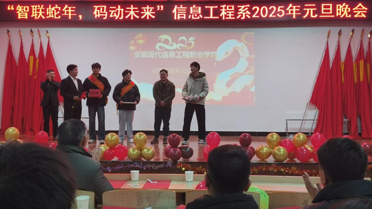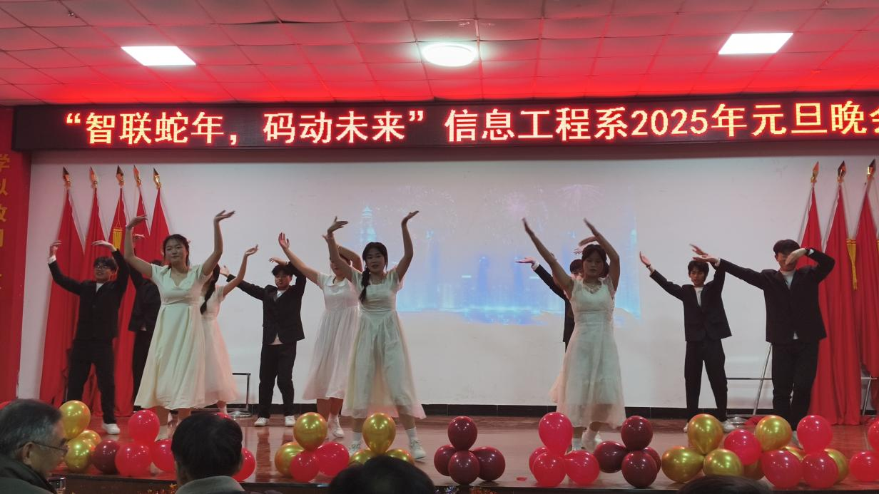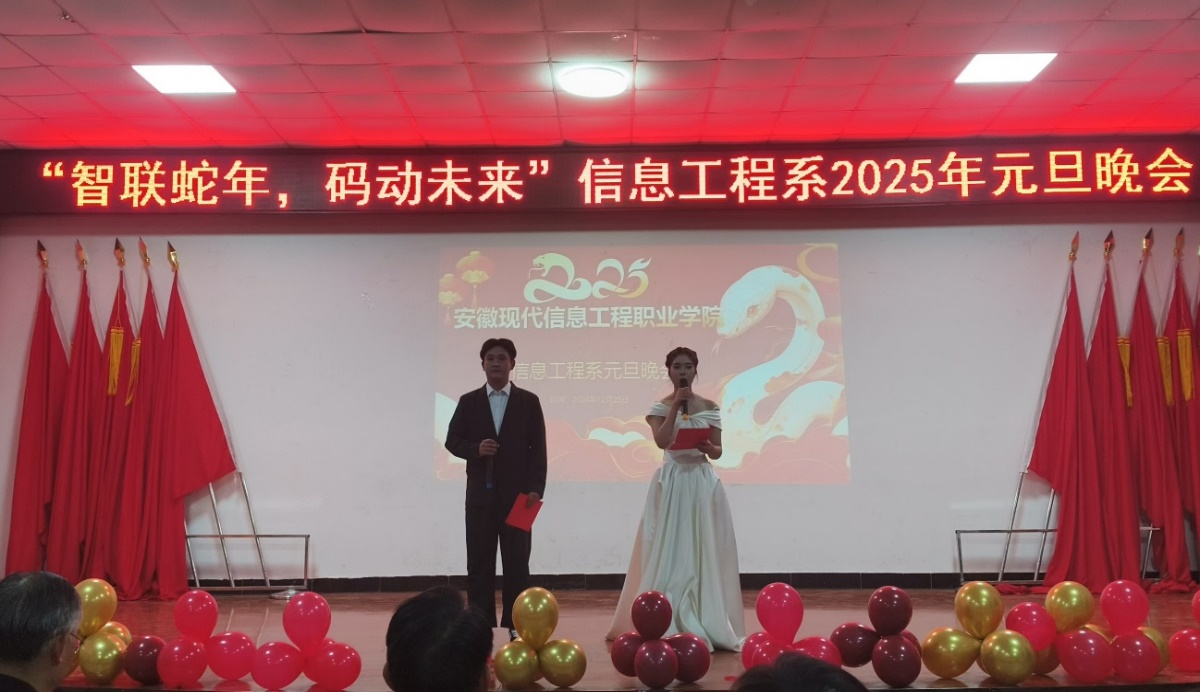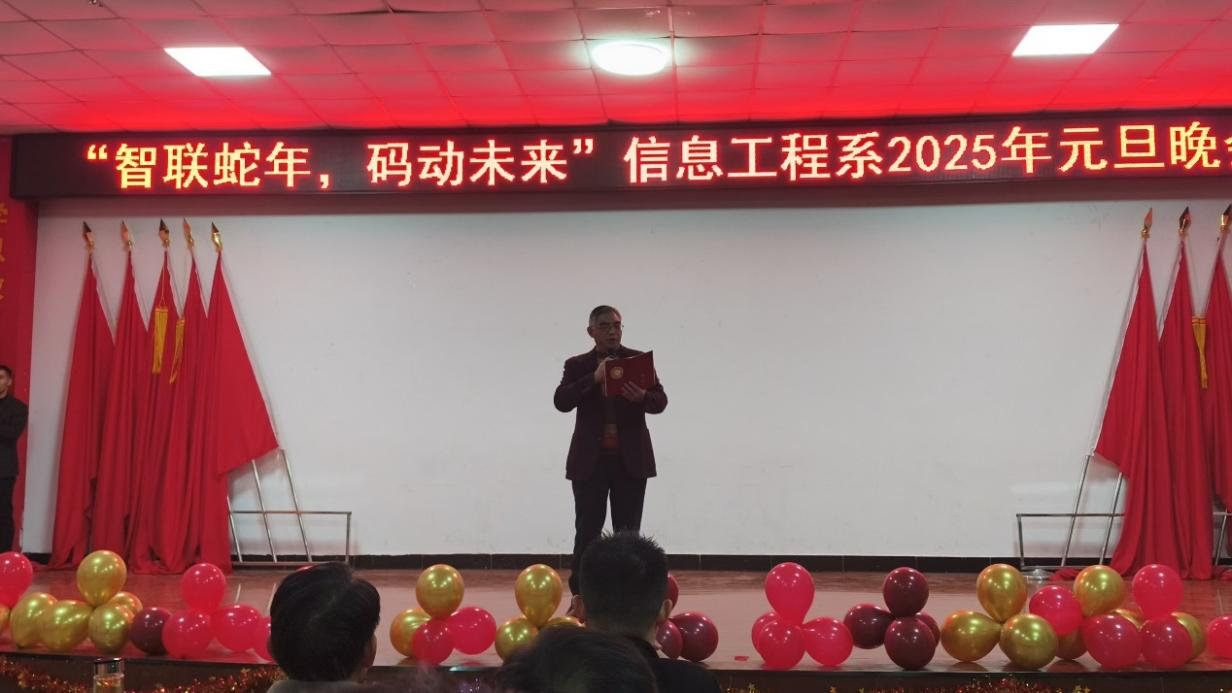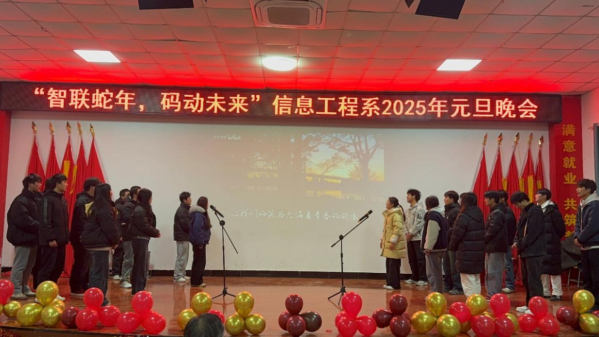 2024年12月25日晚,信息工程系于学院多功能报告厅盛大举办2025年元旦晚会,主题为“智联蛇年,码动未来”。晚会前夕,学院督导专员、党委书记卢义忠与常务副院长周林峰亲临现场。信息工程系全体师生欢聚一堂,共襄盛举。此外,艺术建工系主任徐磊、副主任夏巧等学院领导也莅临观赏,为晚会增添了更多光彩。