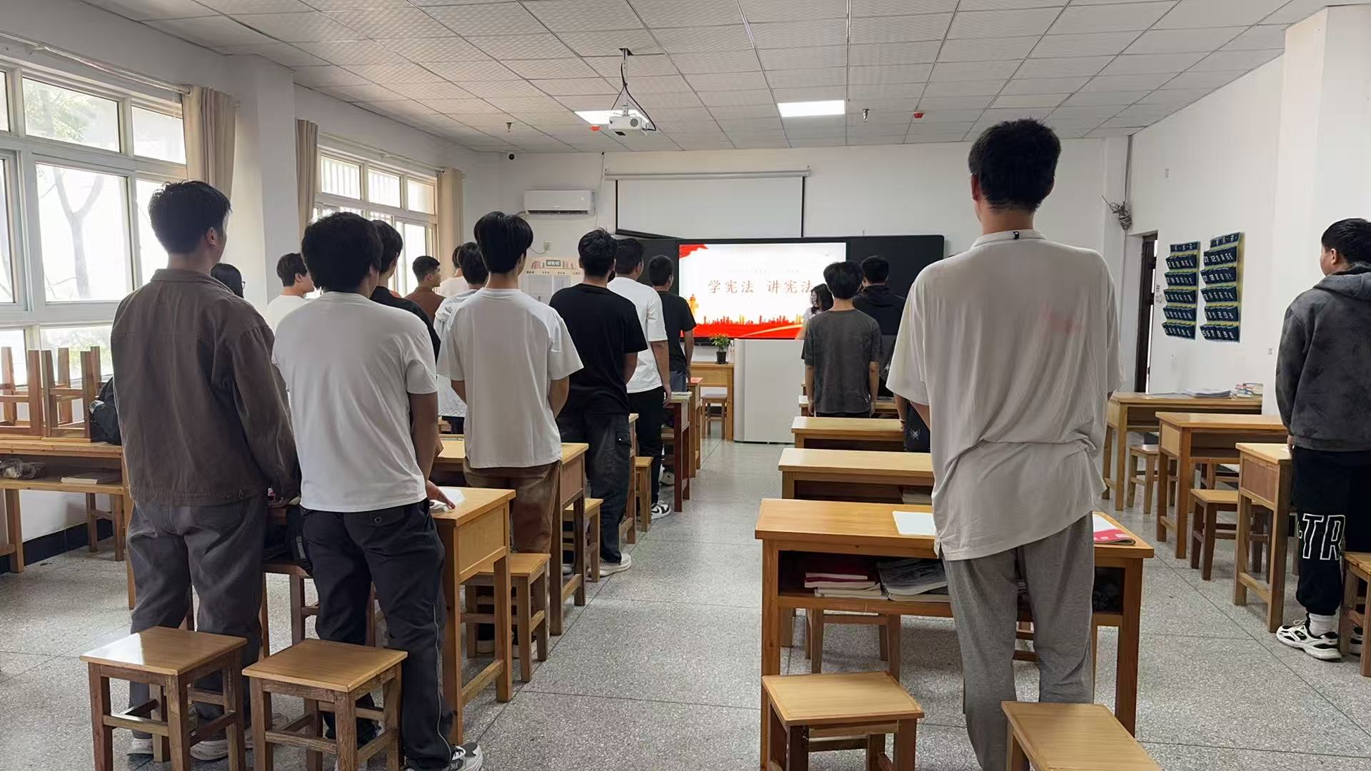 活动渐近尾声,整个教室内弥漫着庄严肃穆的气息。全体人员整齐划一地缓缓起立,身姿挺拔,神情专注。同学们以最虔诚、最庄重的姿态,准备进行神圣的宪法宣誓。