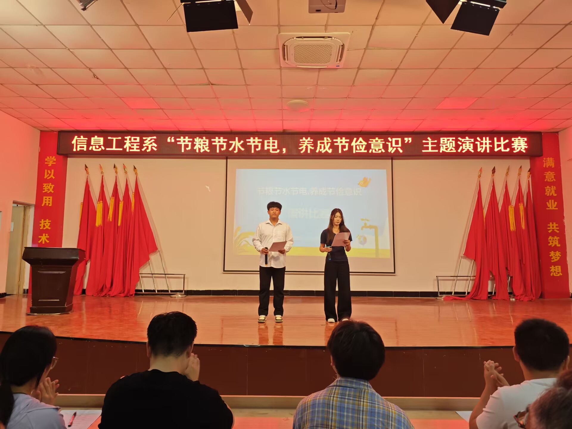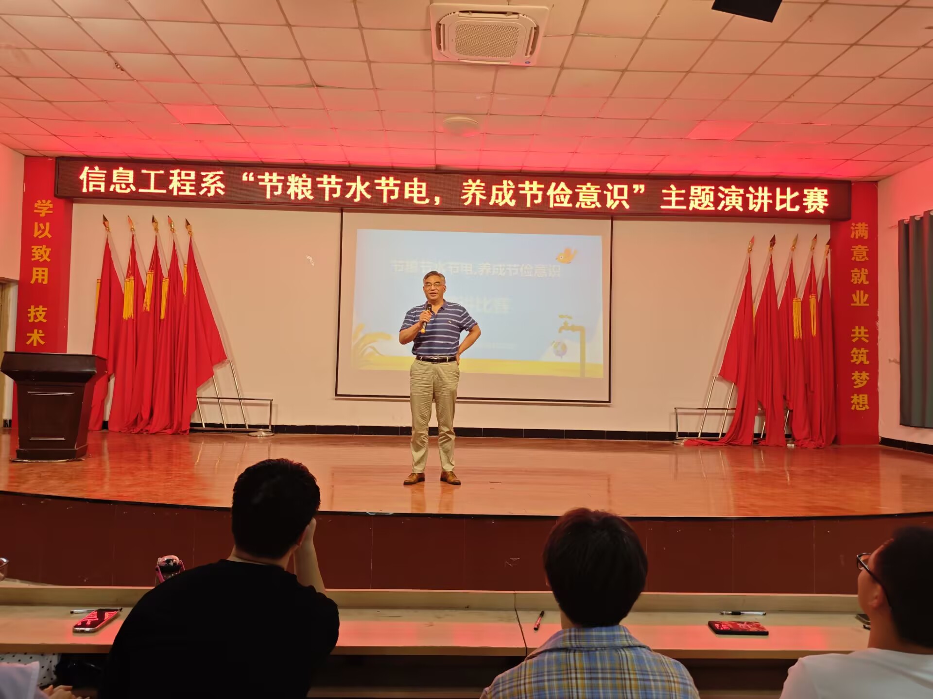 2025年5月23日下午4时,信息工程系“节粮节水节电,养成节俭意识”演讲比赛在热烈的氛围中拉开帷幕。系主任邵毅和系副主任陈亚东莅临指导,全体老师担任评委。