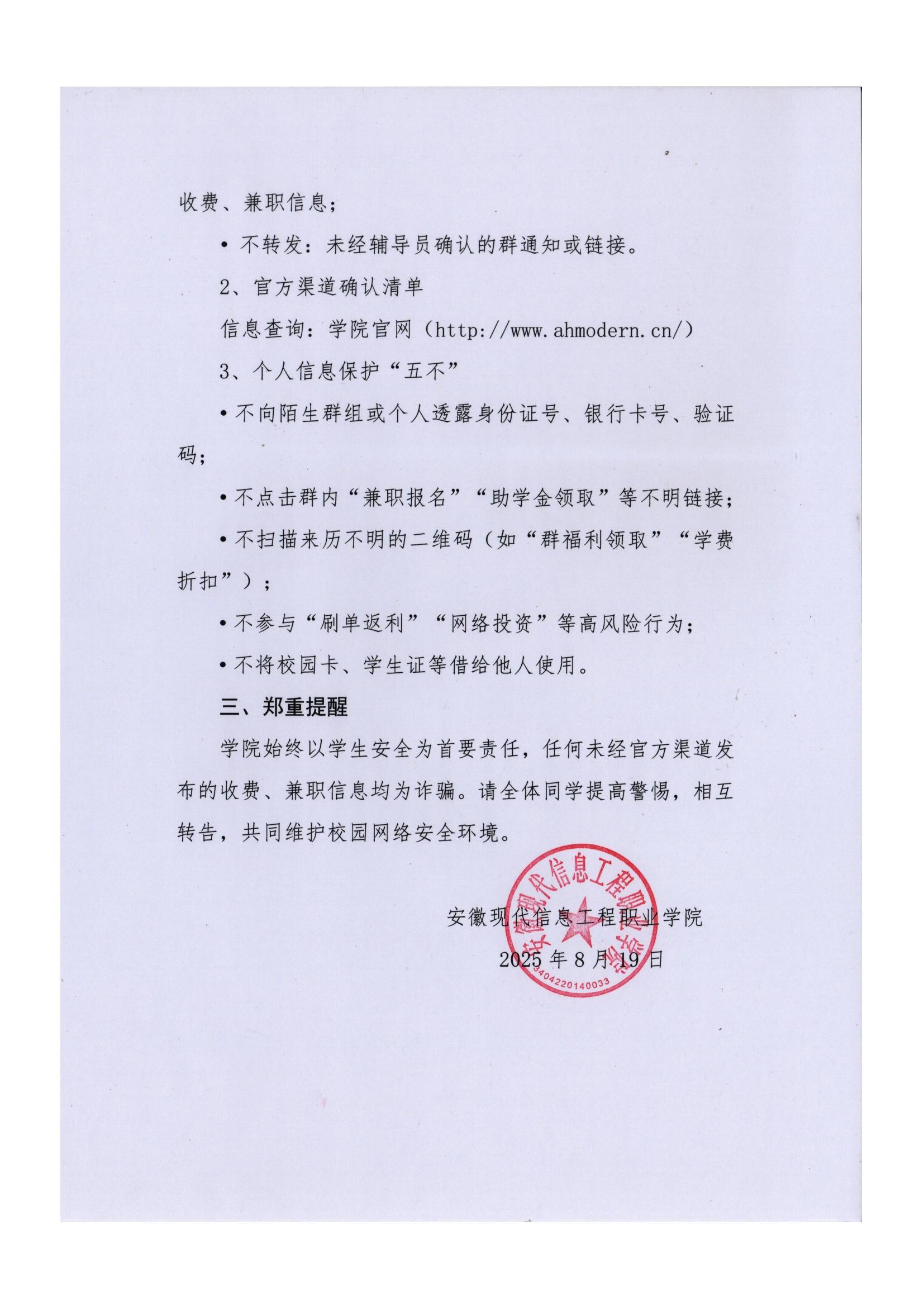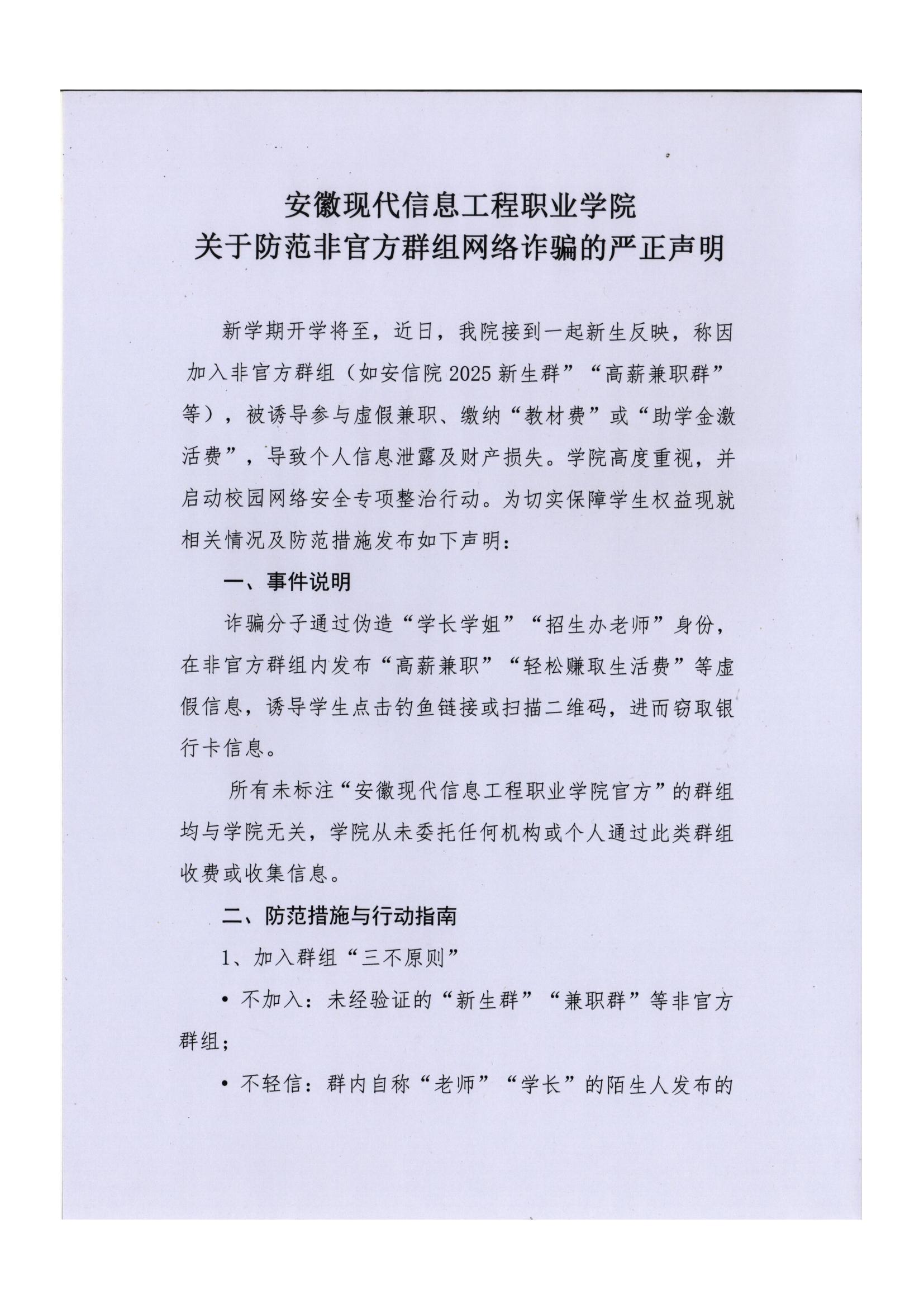 安徽现代信息工程职业学院 关于防范非官方群组网络诈骗的严正声明