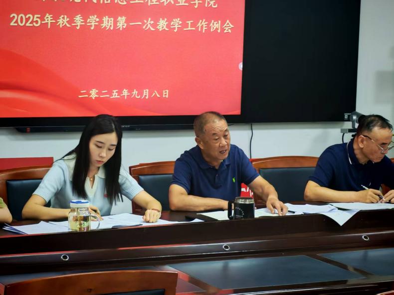 为统筹推进新学期教学工作,筑牢教学核心地位,确保教学秩序平稳高效,2025年9月8日下午,我院于行政楼二楼会议室组织召开2025年秋学期第一次教学工作例会,会议由院长助理刘敏主持,院党委副书记、院长肖成兵、副院长李阳、教学总督导蔡泉、教务处李莉莉书记、教务处全体人员、各系部正副职主任参加了会议。