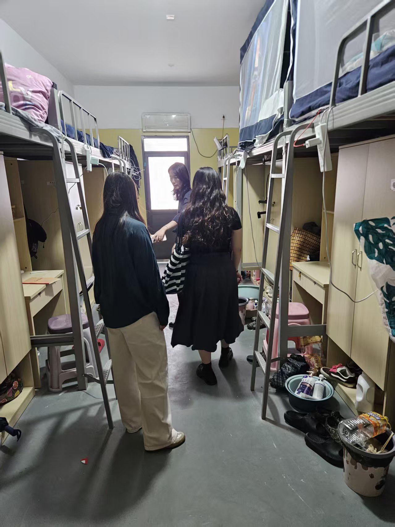 除安全检查外,本次检查中还聚焦宿舍文化育人功能。检查小组对各宿舍的“学风建设角”、“文明公约墙”等特色区域给予高度评价,并鼓励学生以宿舍为单位开展读书分享、创新创业等主题活动。江主任指出:“宿舍不仅是生活空间,更是思想交流、习惯养成的重要平台。要通过‘一舍一特色’建设,让宿舍成为学生成长成才的‘温馨港湾’。”