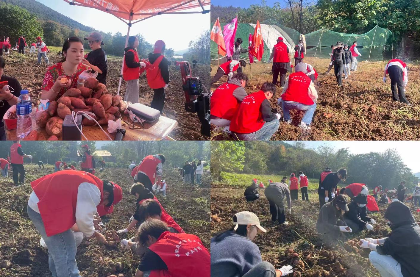 2025年10月5日下午,秋阳似火,暖意正浓。安徽现代信息工程职业学院五年高职部50余名师生,在系部主任庄雪芹,副主任李远萍、吴跃婷的统筹组织与带领下,怀揣着对乡村振兴的热忱,奔赴寿县八公山蜜薯基地,开展了一场“田间助农+直播带货”活动。用专业与实干为种植户送上“及时雨”,以青春之力绘就乡村振兴新图景。