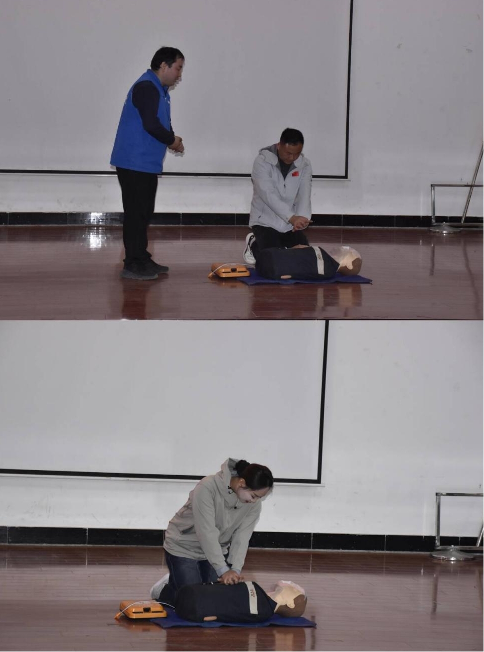 在实操体验环节,沈玉宝老师专业指导下,两位受邀老师率先进行AED操作与海姆立克急救法演练。从设备开启、电极片粘贴到规范按压、模拟除颤,每一个步骤都严格遵循标准流程。同时,沈老师针对实操中出现的细节问题实时纠正,手把手指导动作规范,让参训人员直观掌握急救技能的关键要点,有效克服了应急施救的紧张心理。