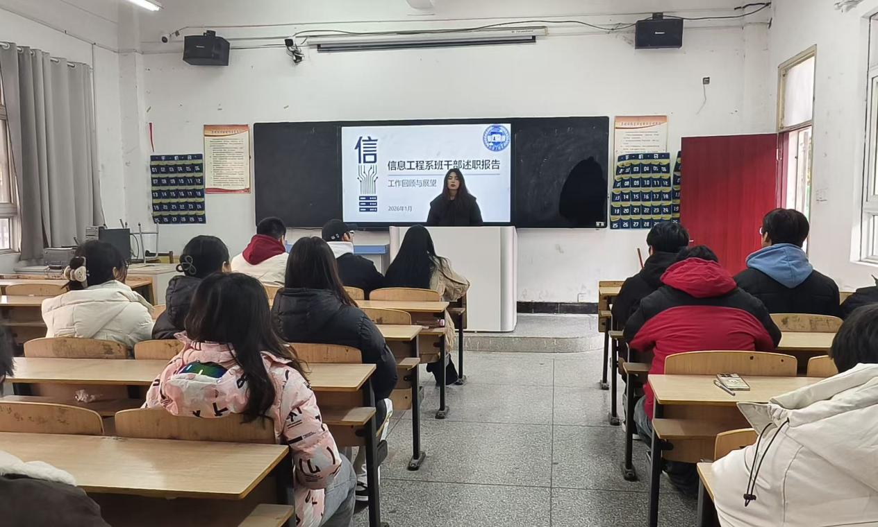 为总结工作成果,强化学生干部队伍建设。2026年1月7日下午3点20分,信息工程系班干部及学生会述职报告会在阶梯教室五召开。信息工程系副主任陈亚东、团支部书记黄佳、辅导员郑礼锦、系部教师方志军、史云涛出席指导,全体学生干部及各班级学生代表参会。