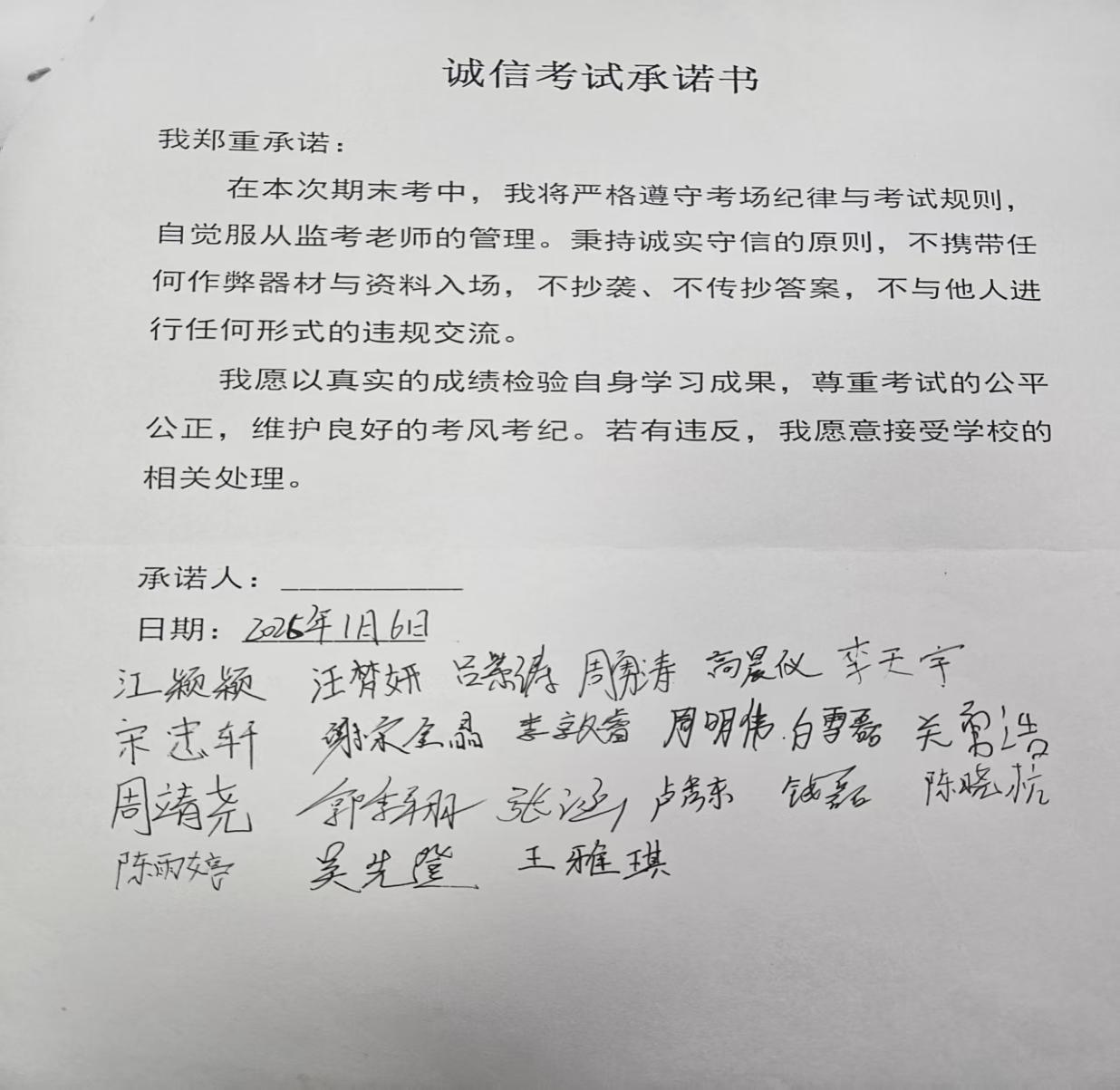 互动环节同学们围绕“诚信应考”展开热烈讨论,分享备考心得与自律方法。部分班级邀请学业优秀学子传授高效复习经验,引导大家摒弃侥幸心理,将精力投入扎实备考中;还有班级发起“诚信倡议”,由学生代表领誓,全体同学庄严承诺严守考纪、拒绝舞弊,铿锵誓言彰显践行诚信的坚定决心。最后,各班组织签署了《诚信考试承诺书》,承载着对学术诚信的坚守与对自身责任的担当。通过教师交流会推送考场规则与诚信寄语,营造“诚信光荣、作弊可耻”的浓厚氛围,形成全方位教育引导格局。